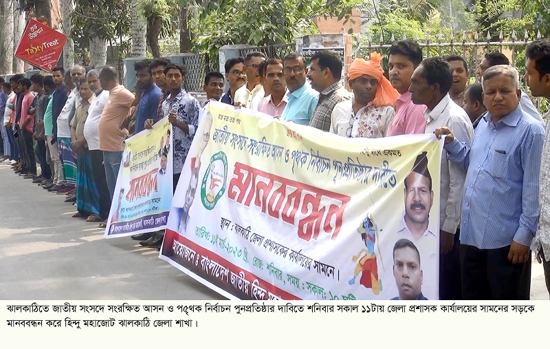যতহাত, ততপথ হিন্দু স্বার্থে একমত, এ স্লোগান নিয়ে মানববন্ধন কর্মসূচির আয়োজন করে হিন্দু মহাজোট ঝালকাঠি জেলা শাখা। এতে হিন্দু সম্প্রদায়ের নেতৃবৃন্দ অংশ নেন।